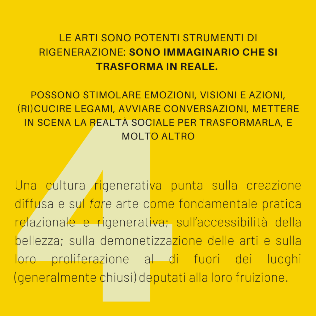 Le arti sono potentissimi e trasversali strumenti di rigenerazione: sono immaginario che si trasforma in reale. Possono stimolare e alimentare piacere, emozioni forti, visioni e atti di cambiamento, (ri)cucire legami, attualizzare audaci esperimenti di pensiero, avviare conversazioni, mettere in scena la realtà sociale per trasformarla, catalizzare comunità virtuose e solidali in momenti di crisi, innescare processi di rigenerazione in contesti marginali, e molto altro.