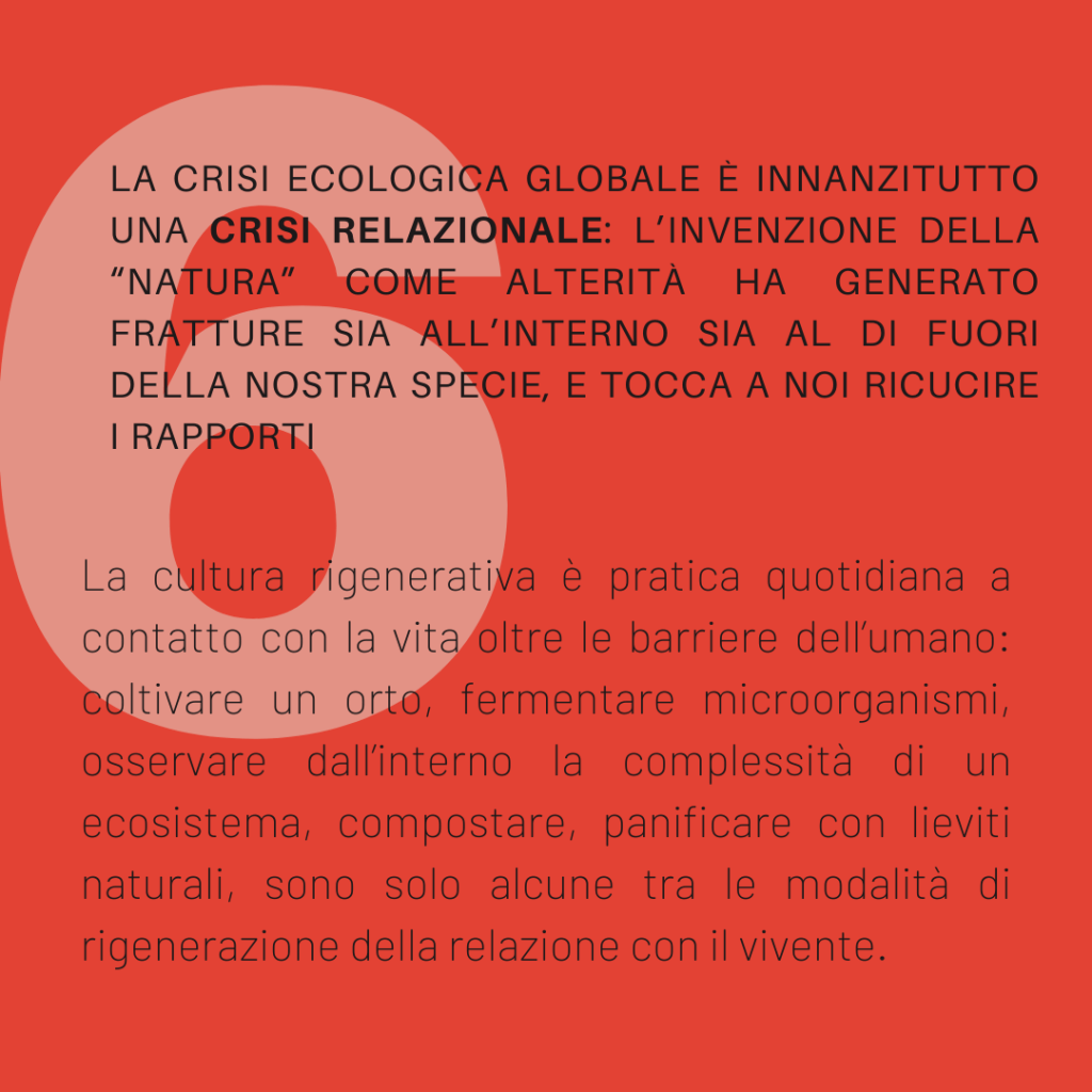 Una cultura rigenerativa è pratica quotidiana a contatto con la vita oltre le barriere dell’umano: coltivare un orto, fermentare microorganismi, osservare dall’interno la complessità di un ecosistema, compostare materia organica, panificare con lieviti naturali, progettare partendo da modelli ecosistemici, tornare ad abitare paesaggi ferali e abbandonati grazie a nuove alleanze tra specie, sono solo alcune tra le modalità di rigenerazione della relazione quotidiana con il vivente.