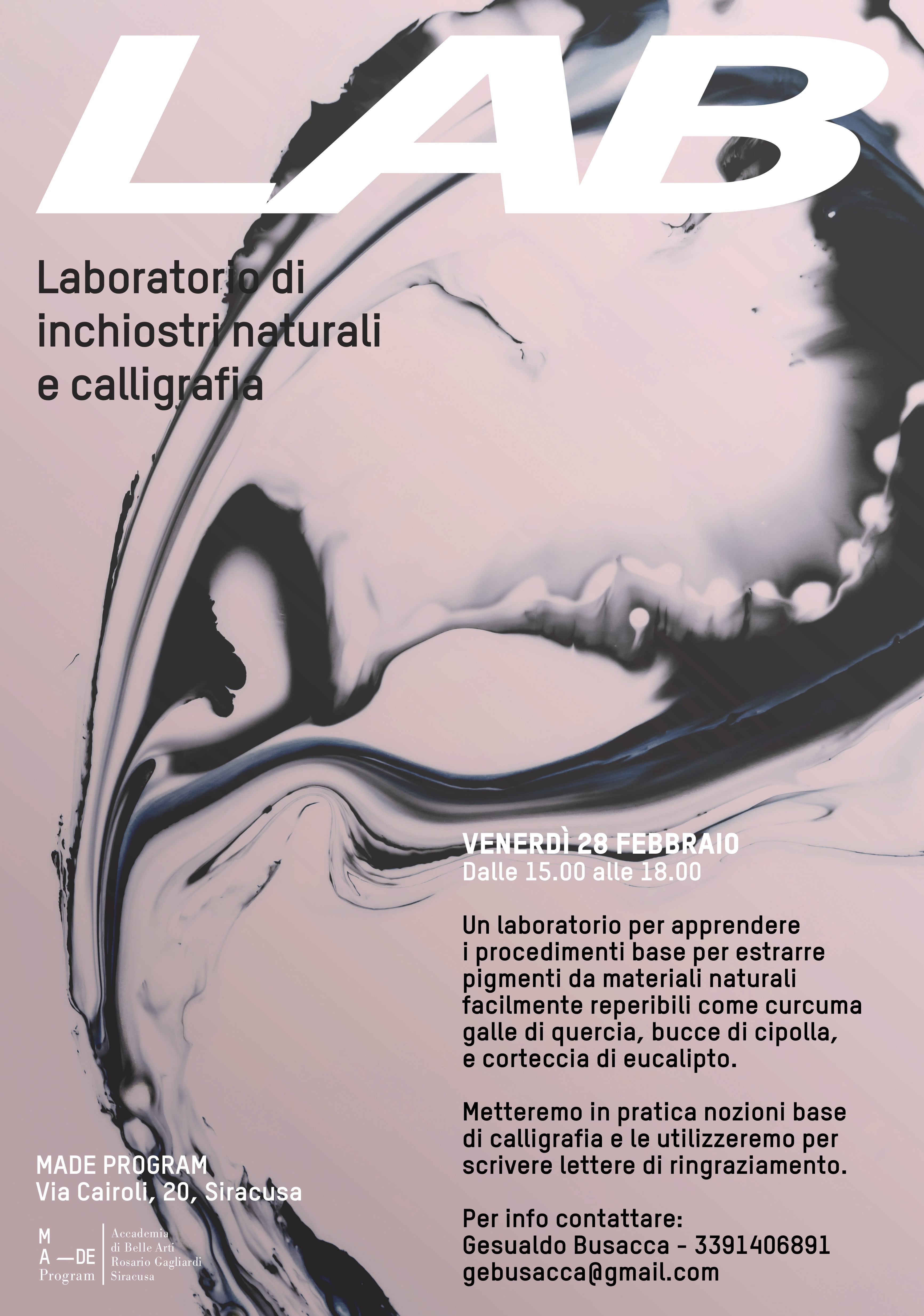 Durante questo laboratorio, impareremo a creare inchiostri a base di materiali naturali facilmente reperibili. Scopriremo alcuni procedimenti e materiali di base per realizzare alcuni inchiostri a base di galle di quercia, curcuma, bucce di cipolla, corteccia di eucalipto e altri materiali. Una volta ottenuti gli inchiostri, li utilizzeremo per scrivere lettere di ringraziamento a chi ce li ha donati, imparando anche nozioni base di calligrafia. Questo laboratorio ha lo scopo di accendere la nostra curiosità sul mondo dei colori naturali, esercitando anche la nostra capacità di gratitudine ed espressione creativa.