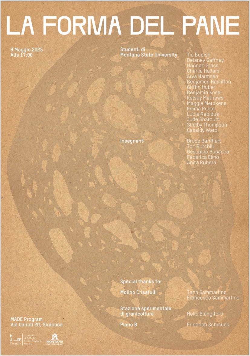 Vernissage di una mostra di lavori realizzati dalle studentesse del Montana State University nell’ambito di un corso di “Bread Design”. Sono stato coinvolto come docente di una parte introduttiva sulla cultura e la storia del grano e del pane in Sicilia, durante la quale abbiamo anche visitato la Stazione Sperimentale di Granicoltura e il Molino Crisafulli a Caltagirone. Sono molto curioso di vedere come le studentesse hanno rielaborato le forme tradizionali del pane in Sicilia partendo anche dal loro vissuto di un’altra regione granicola (il Montana) in un altro angolo del pianeta.