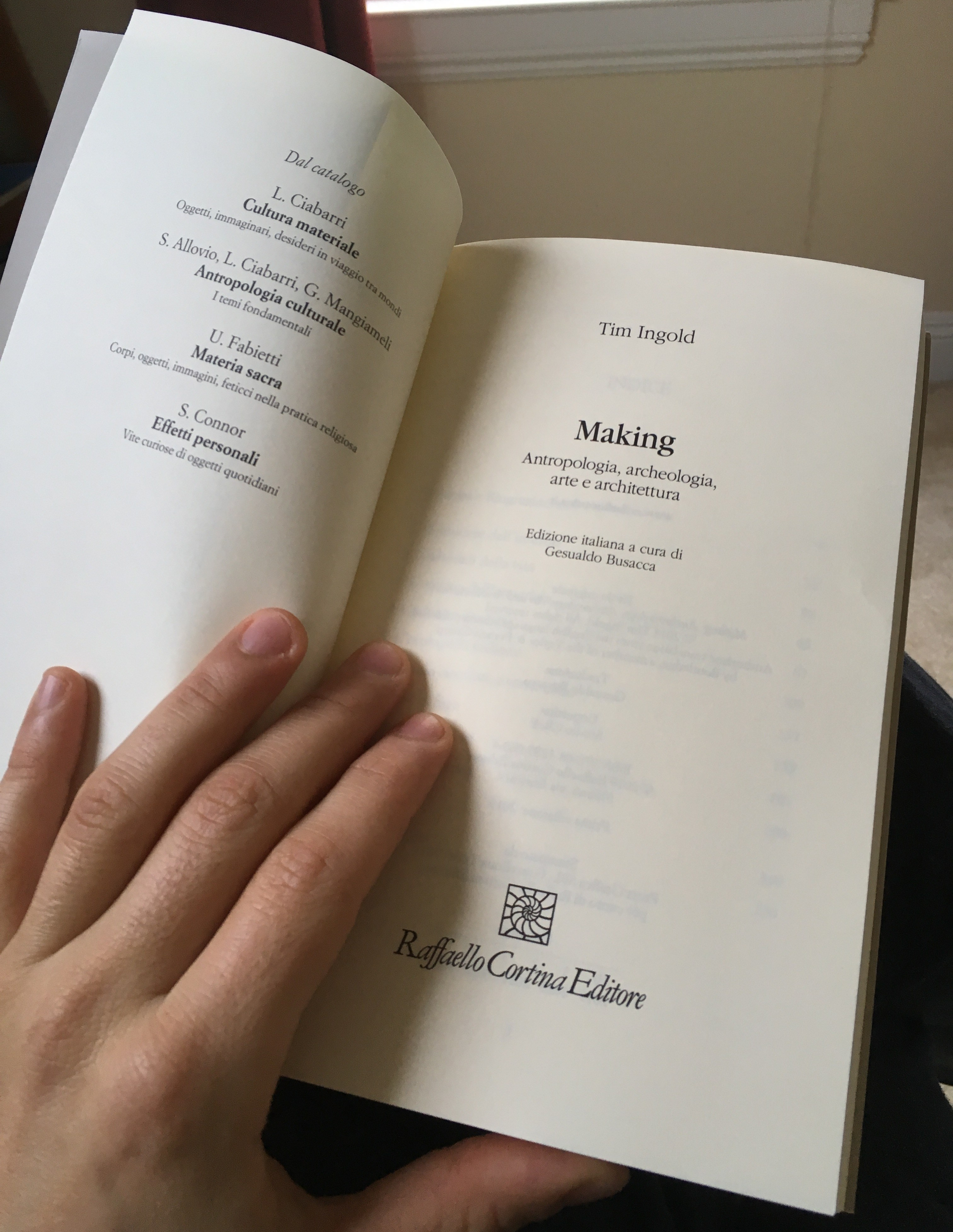 As my first translation project, I curated the Italian edition of Tim Ingold’s Making, published in 2019 by Raffaello Cortina Editore. It is a beautiful book that investigates human creativity bringing together anthropology, archaeology, art, and architecture, and inviting us to rethink making in a way that is respectful of the materials of life and acknowledges their essential contribution to everything we make.